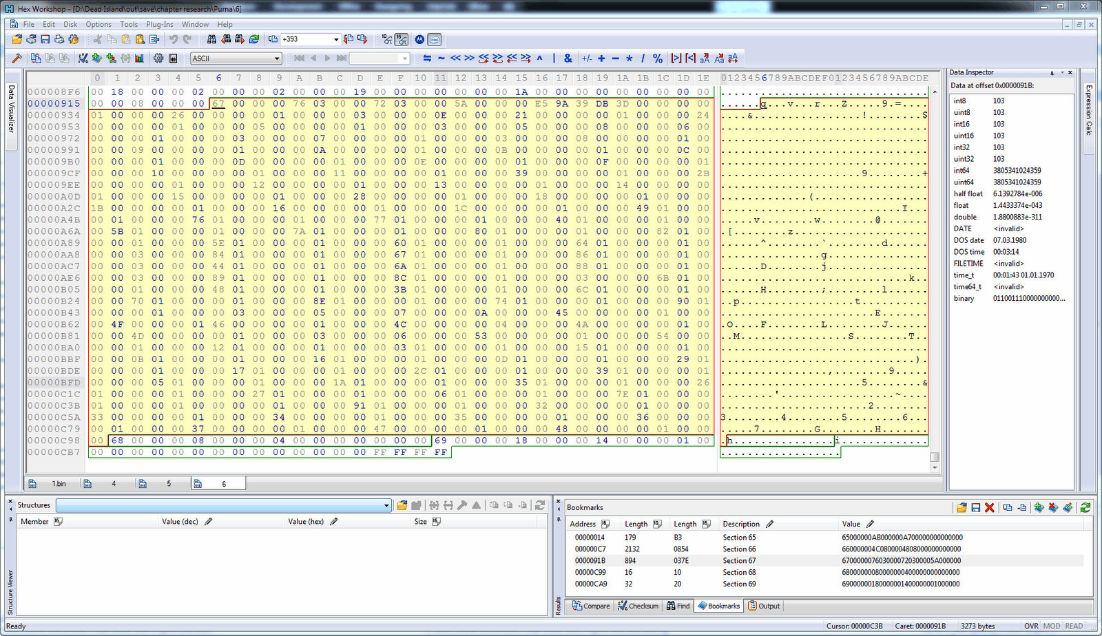 If you use Hex Workshop (like I), you can use my bookmarks. It locates and highlights sections 65 to 69 (hex) or 101 to 105 (dec). Just click on the section you want (in the list in the bottom-right corner).