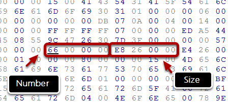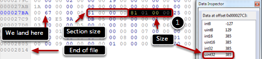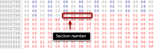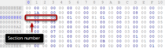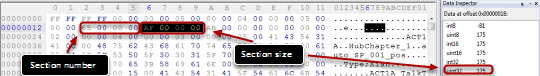 Note the section size (AF 00 00 00 as hexadecimal, or 175 as decimal). If you use the hex value, you have to swap/reverse the byte order. It means that AF 00 00 00 backwards, becomes 00 00 00 AF, and you can remove the leading zeros so that you have just AF in the end.