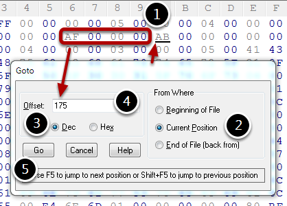 Skip the selection, so that the caret is on the right place where we'll jump from (1). We'll jump from the current position (2). As you saw in the last step, the decimal (3) value was 175 (4). You can choose "Hex" as well and just type in "af".