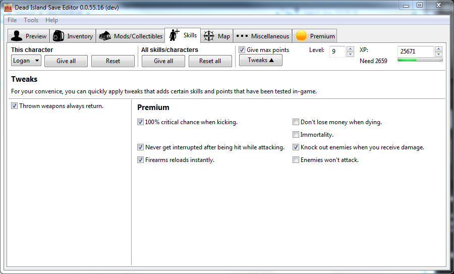 - Added "Give max points". If you keep this checked while giving all skills, you will max out skills, not just up to the original in-game limit.