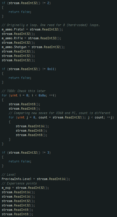 The next thing I do is to study the game under a debugger on the PC, and checking exactly how the game reads the saves. If you're not familiar with debugging, here's a page on Wikipedia. Had the game been released only for game consoles, debugging would unfortunately not have been an option.