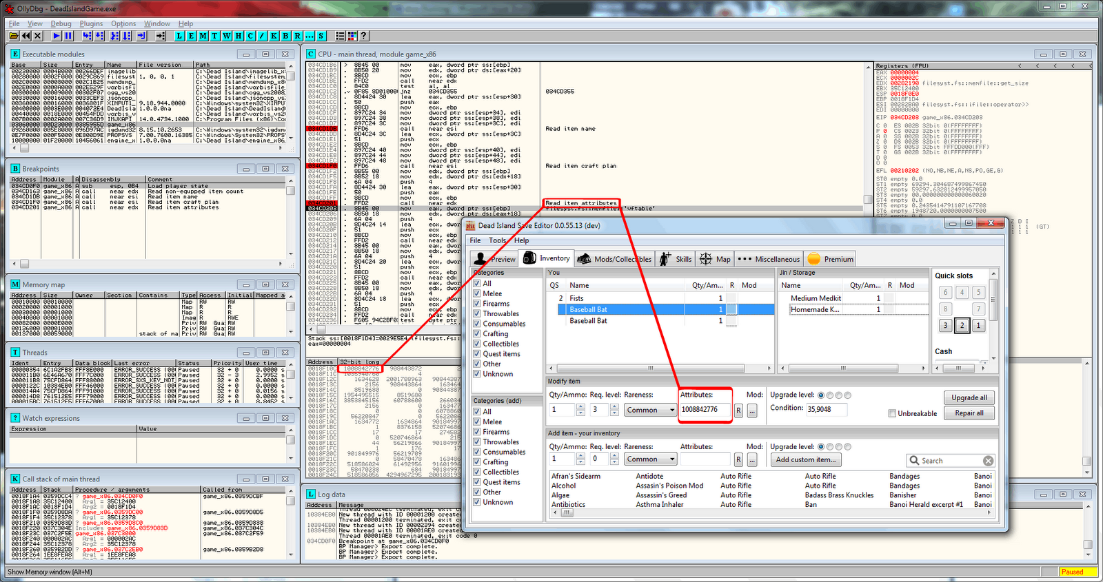 I explained my own process for understanding game-saves for Dead Island, and how the game reads inventory items. I won't say it's the best method, but it has helped me understand how it works. I didn't explain how to reach the point where inventory items are read, but that would make this post quite lengthy. I also didn't show you exactly how DISE modifies values, but it's just a matter of reversing the read process to make it write the values instead.