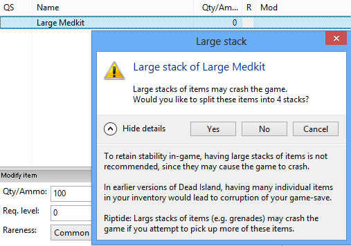 - Offer to split up large stacks of items when inputting the quantity, to prevent crashing the game.