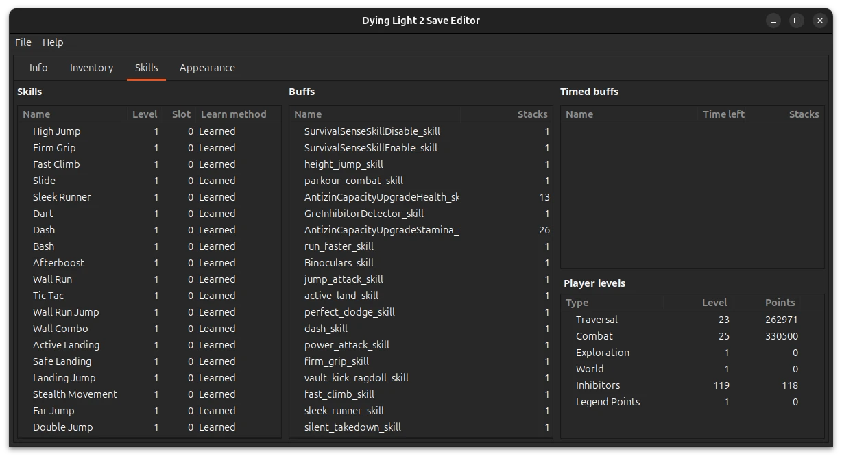 Free, cross-platform Dying Light The Beast game save editor. Edit your inventory, skills, map fog, unlock collectibles, outfits and more.